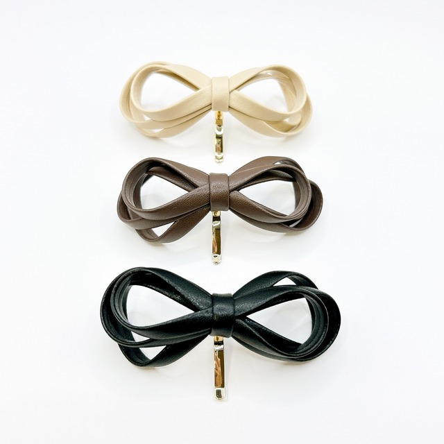 立体感のあるリボンのデザインにレザー調でスタイリッシュでオシャレなアイテムです♫ ゴムにフックをさすだけなので忙しい朝にもピッタリのアイテムです! 普段使いはもちろん、特別な日のコーディネートにもピッタリです✧︎*。 [サイズ] 長さ 約9cm フック長さ 約3cm ☆日本製☆