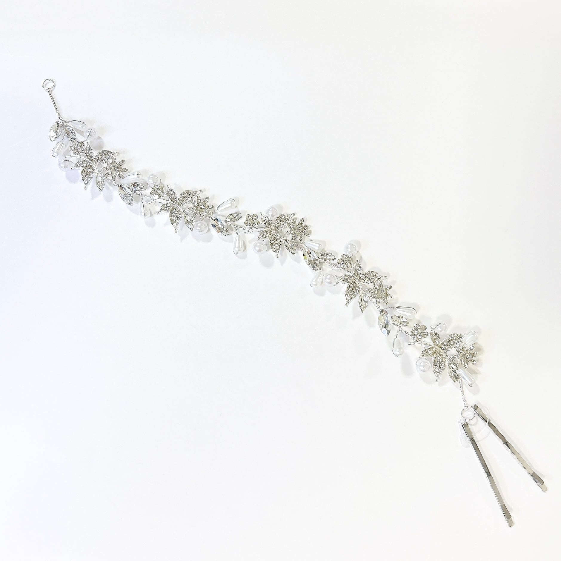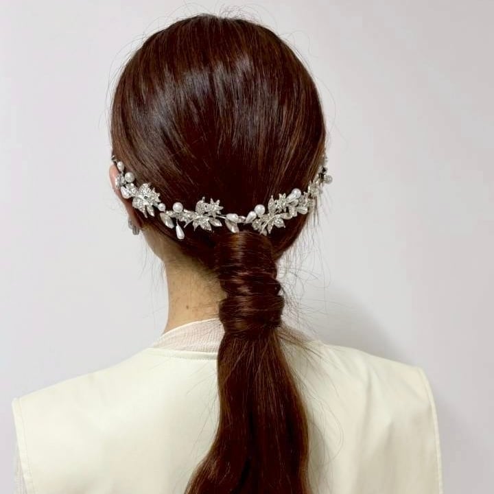 頭のカーブに沿って装着できるよう、連なった装飾がデザインされており、髪の毛の上部に沿って着用します。
